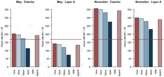 - A sufficiently detailed moisture profile grid—particularly one that distinguishes the outermost 5 mm and the wooden layer exposed to rain (layer A) from the rest of the panel—is necessary to accurately predict the evolution of moisture content and subsequent decay risk. Simplified profiles that use an overall average or even layer-specific averages are insufficient.
