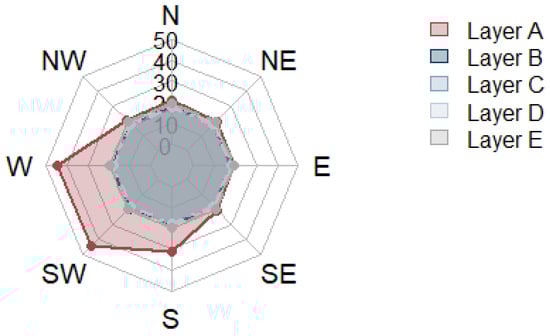 - Orientation: The orientation of the CLT panel had pronounced effects on the moisture content in layer A and the outermost 5 mm of the CLT panel. The highest average moisture content in the different layers is found in the West, South-West, and South orientations. A difference in average moisture contents in layer A was found to be about 24.83 %points between the different orientations. In the outer 5 mm, the difference is almost 84.26 %points. Both emphasize that exposure conditions during the construction phase critically affect the moisture profile. The difference between the different orientations in the other layers is limited to 1.75 %points.