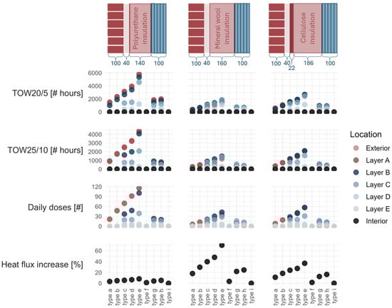 - TOW20/5:At the interior surface, all wall assemblies achieved a TOW20/5 value of zero, indicating effective moisture control in this zone. However, at the exterior surface, performance varied markedly with insulation type and moisture profile. For instance, all but two wall assemblies with PUR insulation exceeded the 720-h threshold in all cases (except for moisture profile types f and i), while those with mineral wool insulation breached the limit solely under the worst-case scenarios (moisture profile types d and type e). Wall assemblies with cellulose insulation did not exceed the 720-h threshold under the scenarios for the lowest rain exposure of 0.1 (moisture profile types f, g, h, and i) and in case of an average rain exposure of 0.5 in combination with a delivery moisture content of 16% (moisture profile type a).