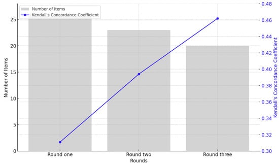 Figure 1 illustrates a composite of the relationship between the number of items examined every round (bars) and the Kendall concordance coefficient (line). This demonstrates how reducing the number of items every round increases expert agreement, as evidenced by an increase in the concordance coefficient. Table 5 shows the criteria based on abbreviations.
