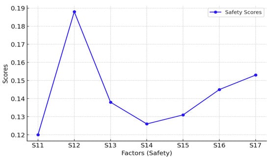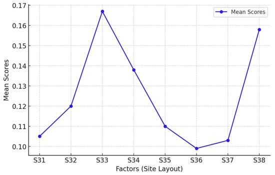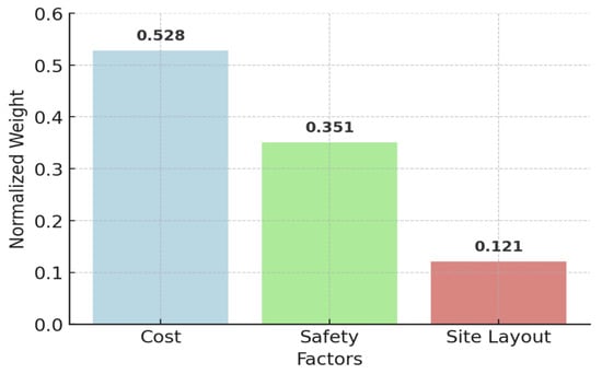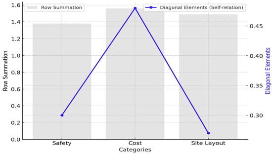 Figure 2 shows a dual depiction of the data to help understand the factor interactions. The bar graph displays the row summation and illustrates the total influence of each category (safety, cost, and site layout) based on their interactions with other variables. Simultaneously, the line graph displays the matrix’s diagonal elements, demonstrating each factor’s self-relationship or inherent relevance.