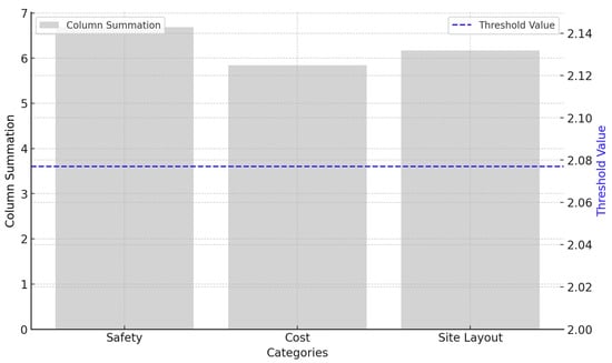 Figure 3 effectively combines two key aspects of the data: the column sum (represented by the bars) and the threshold value (represented as a dashed line). The bar graph shows the total impact of each category (safety, cost, site layout) based on the T values collected, allowing for a direct comparison of their overall impact. The threshold line provides a reference point and indicates whether the values in each category exceed or fall below the established criterion (threshold value = 2.077).