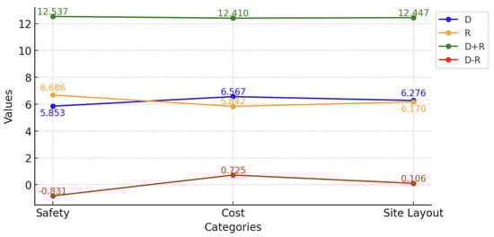 In Figure 4, the advanced multi-line plot shows D, R, D+R, and D-R values across categories (safety, cost, site layout) using distinct, visually appealing colors. Each line represents a unique dataset, allowing for clear comparisons and trend analysis. Gridlines and fixed markers improve readability and make spotting changes and relationships between data points easier.
