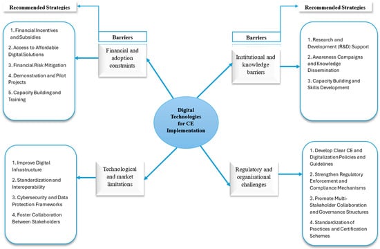 Based on the study’s aim and empirical findings, a comprehensive framework has been developed to address the barriers to digital technology adoption for CE implementation in the construction industry of a developing country. As illustrated in Figure 1, the framework outlines four key barrier categories, each with targeted strategies to promote effective digital technology adoption within the CE paradigm.