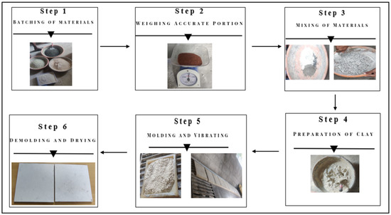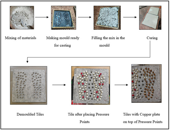 The smart capsule bubble tile (SCBT) is constructed using widely accessible materials, guaranteeing repeatability under experimental circumstances [36]. The principal binding agent is ordinary Portland cement (OPC) 53 Grade, with particle sizes between 1–50 µm and an average size of 10–20 µm, promoting appropriate hydration and strength enhancement. OPC primarily comprises calcium silicates (C3S and C2S), which enhance both early and long-term strength, and calcium aluminates (C3A and C4AF), which affect setting time and durability. Manufactured sand (M Sand), an essential element, offers a consistent texture and improves workability; it is predominantly composed of silica (SiO2) with minor oxides of aluminum, iron, and calcium. Coarse aggregate measuring 6 to 12 mm is included to enhance the structural integrity of the tile, generally consisting of crushed stone, which includes quartz (SiO2), feldspar, and other silicate minerals, hence augmenting compressive strength. Aluminum oxide (Al2O3) powder, exhibiting a particle size distribution of 1–100 µm, improves hardness and wear resistance while offering chemical stability owing to its inert characteristics. Copper powder, averaging 10–20 µm in particle size, is used for its electrical conductivity and thermal characteristics, enabling electromagnetic wave stimulation [37]. Copper exhibits chemical stability and has significant oxidation resistance in arid conditions, guaranteeing prolonged efficacy. Moreover, color oxide pigments, mainly consisting of iron oxides (Fe2O3, Fe3O4), are used for aesthetic reasons, offering durability, hence assuring their appropriateness for high-traffic situations. These standardized materials enhance the tiles’ mechanical, thermal, and aesthetic features, guaranteeing uniformity in trial results [38]. Figure 4 illustrates the step-by-step process for producing the mixture, encompassing batching, weighing, mixing, moulding, and de-moulding, along with the necessary ingredients and rubber mould.