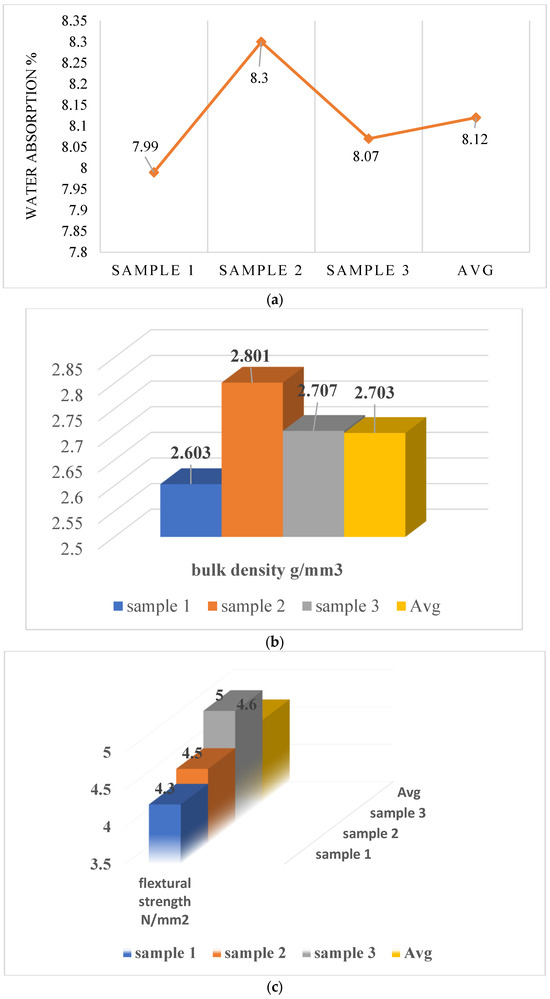 Bulk density is defined as the mass of a unit volume of dry soil, whether in its native state or after compaction. IS 1237 specifies a method for evaluating soil’s bulk density, requiring removing a core sample using a cylindrical metal core cutter [48]. A hammer or mallet is often used to drive the core cutter into the earth. After appropriate extraction from the soil, the core is weighed to ascertain the overall mass of the soil [48]. The volume of the core is ascertained using a core cutter. The bulk density of soil is calculated by dividing the soil’s mass by the core sample’s volume. The international standard, IS 1237, specifies the unit of measurement for bulk density as grams per cubic centimeter (g/cm3) or kilograms per cubic meter (kg/m3). The bulk density is obtained from the measurements of water absorption. Three samples were obtained. The bulk density values for sample 1, sample 2, and sample 3 were 2.603 g/mm3, 2.801 g/mm3, and 2.707 g/mm3, respectively. The average bulk density for water absorption in cooling tiles is 2.745 g/mm3. Figure 8b shows the bulk density values obtained from the three samples.