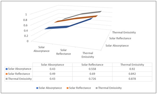 Acupressure tiles provide enhanced thermal qualities relative to conventional materials, making them optimal for situations necessitating thermal comfort. The efficacy of these tiles in heat regulation is assessed by their sunlight absorption coefficient, solar reflectance, and thermal emissivity [52]. Using the solar reflectance index (SRI) test, tests performed on acupressure tiles devoid of copper caps demonstrate a solar absorption value of 0.45, indicating that the tiles absorb 45% of incoming solar radiation. The solar reflectance rating of 0.658, according to ASTM C-1549, indicates that 65.8% of solar energy is reflected, hence mitigating heat accumulation. Additionally, a thermal emissivity of 0.88, according to ASTM C-1371, highlights the material’s capacity to radiate heat, hence maintaining a lower surface temperature efficiently. The characteristics of acupressure tiles provide them with a superior substitute for traditional materials, especially in settings where heat management is essential. Standards like IS 1237:2012 and BS 7976 provide systematic approaches for assessing these attributes, guaranteeing uniformity and dependability in evaluation. Incorporating these tiles into architectural designs allows builders to improve energy efficiency and interior comfort while promoting sustainable and eco-friendly building methods. Figure 9 depicts the solar reflectance, absorption, and thermal emissivity characteristics of three distinct acupressure tile samples, offering a comparative assessment of their thermal efficacy.