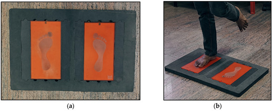 Tiles are subjected to testing and examination performed by individuals. The subject is directed to stand and ambulate on the tiles to evaluate the results. Corrective measures for improvement may be implemented based on the average value obtained from the results of many people. The stress distribution on both legs is initially imbalanced since many people primarily bear weight on either the left or right leg [53]. Pressure builds in the knee joints. It reduces joint flexibility and causes pain. Thus, a force plate evaluates the weight distribution over both legs. Force plates measure athletes’ ground response forces when walking, running, and other physical activities, including jumping. A person was placed on a weighing scale, recording a weight of 64 kg, while the tiles weighed 3.01 kg, for a total weight of 70 kg. Figure 10 shows images of a force plate and a human balancing on one leg atop the force plate for examination, respectively.