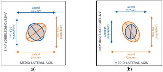 Lateral and longitudinal elliptical area for single-leg: (a) lateral and longitudinal elliptical area for eyes open, (b) lateral and longitudinal elliptical area for eyes closed.