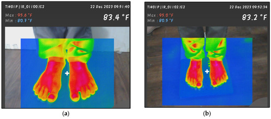 This research utilizes thermal imaging to assess the effects of walking on acupressure tiles on a person’s legs. Initially, thermal imaging was performed as a baseline reference before the subjects walked on the tiles, revealing the normal heat distribution across their legs. After the participants walked over the acupressure tiles, which possess unique thermal properties, a second thermal image was captured to identify any changes in the thermal patterns of the legs. The post-walking thermal images indicated improved circulation, showing increased blood flow and heat dispersion [57]. Acupressure tiles are believed to influence these results due to their distinctive characteristics, including enhanced conductivity and stimulation of pressure points. This research offers a scientific viewpoint on the potential benefits of acupressure tiles for improving blood circulation and overall health in the lower extremities. By employing thermal imaging as an innovative analytical tool, the study provides valuable insights into how walking on specialized surfaces elicits dynamic physiological responses. The findings demonstrate that the thermal dynamics of human legs are considerably affected by concrete acupressure tiles, as evidenced by thermal imaging. Walking elevates leg temperature, suggesting a pre-exercise state, while ambulation on the acupressure tiles significantly drops leg temperature. This temperature decrease may be attributed to the enhanced blood circulation facilitated by acupressure stimulation, which promotes vasodilation by activating the acupressure sites. Vessel enlargement enhances the flow of nutrients and oxygen to the muscles, which helps to dissipate heat produced during exercise. Acupressure stimulation helps relax the ribs, which reduces stress and improves overall comfort. The observation that body temperature decreases after walking indicates that the body responds positively to the combined effects of acupressure and exercise. This demonstrates how this practice can enhance blood circulation and participants’ overall health. In a therapeutic context, evaluating the effectiveness of acupressure tiles involves assessing how body weight is distributed across a customized surface before and after walking. Two weight scales accurately measure a person’s body weight before walking for each foot. This allows for a precise assessment of weight distribution between the left and right legs. The data collected before walking serves as a reference for future comparisons. The exact weight measurement procedure is repeated after the individual has walked on the acupressure tiles to observe any changes in weight distribution. The key focus of this evaluation is to determine whether acupressure stimulation affects how body weight is distributed between the legs during walking. Changes in weight distribution might indicate how well the acupressure tiles work to correct posture, enhance balance, or ease specific musculoskeletal issues. This evaluation greatly enhances physiotherapy therapies, which provide measurable information on how acupressure affects weight-bearing and movement. Physiotherapists may improve therapy results by using this information to adjust treatment methods, track patient progress, and address unequal weight distribution. These evaluations’ use of acupressure tiles emphasizes the need for accurate and impartial measures to enhance patient treatment via a comprehensive physiotherapy approach. The leg’s thermal imaging before and after walking on tiles is shown in Figure 13.