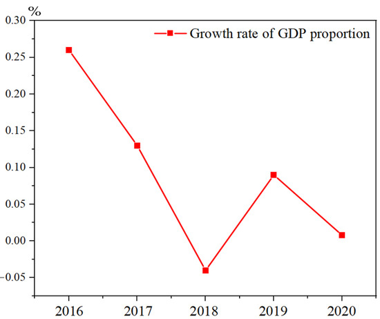 During the 13th Five-Year Plan period, the regional GDP of eco-cities increased from 17.65 billion yuan in 2016 to nearly 50 billion yuan in 2020, and the growth rate of the GDP is shown in Figure 2. There is no primary industry within the scope of eco-city management, and the proportion of secondary industry increased slightly from 16.4% in 2016 to 18% in 2020, while the proportion of tertiary industry decreased slightly from 83.6% in 2016 to 82% in 2020. The tertiary industry has been maintaining a trend of more than 80%. Compared with the secondary industry, the energy consumption of the tertiary industry is significantly lower, and its carbon emission of 10,000 yuan GDP, that is, the carbon intensity, is also significantly lower than that of the secondary industry. Therefore, the trend of maintaining sustained rapid development and a high proportion of the tertiary industry in the eco-city is conducive to controlling the excessive growth rate of carbon dioxide emissions accompanied by economic growth.