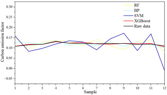 To identify an optimal model for carbon emission forecasting, this research evaluated the predictive accuracy of four machine learning algorithms: random forest (RF), backpropagation neural network (BP), support vector machine (SVM), and XGBoost. Thermal carbon emission factors were utilized as input variables for the analysis. A comparative assessment of model performance is presented in Table 4, while Figure 3 visually depicts the predictive outcomes generated using each algorithm.
