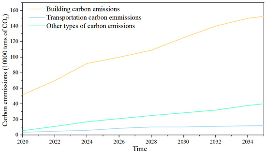 This research employed the XGBoost algorithm to analyze energy consumption and carbon emission factors, utilizing the emission factor methodology for carbon quantification. The dataset was partitioned into training and testing subsets at a ratio of 7:3, with the predictive outcomes illustrated in Figure 4. Carbon emissions from the building sector of the eco-city are on the rise, with projections showing that emissions from the building sector will increase from 517,100 t CO2 in 2020 to 1,554,300 t CO2 in 2035. Carbon emissions from the transport sector of the eco-city show a slow upward trend, increasing from 34,600 t CO2 in 2020 to 121,000 t CO2 in 2035. Carbon emissions from other areas of the eco-city increased from 55,600 t CO2 in 2020 to 423,000 t CO2 in 2035.