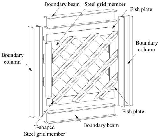 To address the existing limitations of the conventional SPSWs, Yan [17,18,19] introduced an innovative steel grid shear wall structure (SGSW), which evolved from the simplified models of SPSWs established by previous researchers [20,21,22]. The specific SGSW is shown in Figure 1. The simplified tension and compression strips model is replaced by steel grid components, where the steel grid components serve as energy dissipation elements instead of steel plates. These steel grid components work in conjunction with the boundary frame to resist horizontal loads. This new lateral-resistant system avoids noise during the formation of tension zones. In addition, the SGSW adopts tangible steel members to resist lateral loads instead of the tension strips in thin SPSWs which are only formed after loading. Therefore, the SGSW does not need to re-form the tension strips when the structure is subjected to cyclic loading, thereby still maintaining good lateral resistance when the loading direction changes. Additionally, the members of SGSWs are discrete and lightweight, which avoids the non-negligible initial defects during the transportation and installation process. The lighter and smaller steel grid components also make it easier for construction workers to install and transport them, which effectively promotes construction efficiency. Moreover, we also compared the SGSW and the traditional SPSW from the perspectives of lateral-resistant capacity and economy in our previous study [17] and found that the SGSW showed stronger lateral-resistant performance after the first circle of cyclic load, and the cost of the SGSW was less.