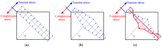 In this paper, the tension strips were materialized as steel grid components. By arranging the steel grid components asymmetrically in the steel frame, the SGSW undertook the hysteretic load by means of the “tension (compression) strip” mechanism. The mechanical mechanisms of the embedded steel grid components in the tension and compression zones were analyzed separately (Figure 3).