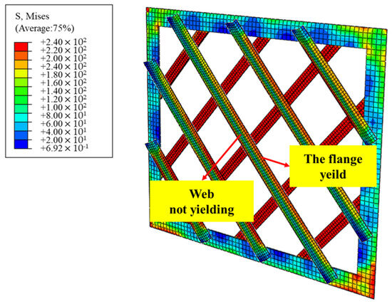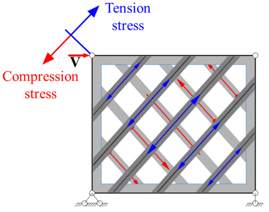 As the research focus of this paper lies in the lateral-resistant performance of the SGSW, the impact of the stiffness of edge members is not considered. In other words, the stiffnesses of the steel beam and column are assumed to be rigid bodies. Therefore, the internal forces of the steel grid components in tension were evenly distributed, and those in compression were also evenly distributed when no buckling occurred.