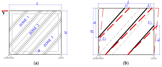 Under the action of lateral load V, the top point of the SGSW would undergo horizontal displacement U. According to the deformation characteristics of the different steel grid components, the SGSW could be classified into three regions (only the unilateral deformation was analyzed according to the symmetry relationship, Figure 4). The steel grid components in ZONE 1 underwent translation and rotation around the connection joint, while the steel grid components in ZONE 2 and ZONE 3 only underwent rotation. The deformation of the steel grid components in the three regions was analyzed, respectively, below.