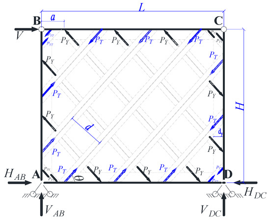 Assuming that the arrangement of the steel grid components is established, its elastic stage force is shown in Figure 5. It is shown that a represents the horizontal distance between the column and the point where the steel grid member intersects with the top beam, and d is the spacing between the steel grid components. And θ represents the angle between the steel grid components and the horizontal direction.