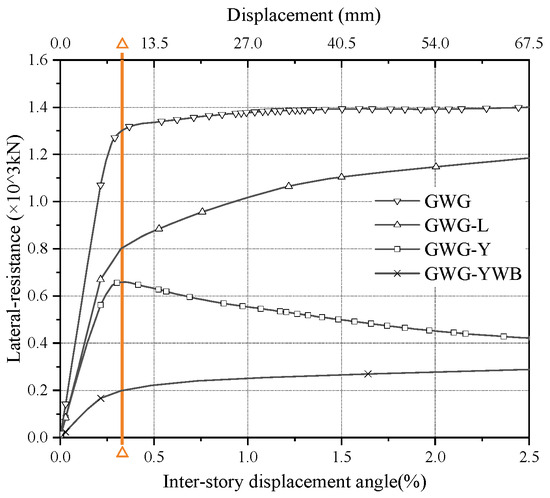 The total lateral-resistance capacity of each component in the SGSW basically followed the superposition principle, and the reliability of the formula was further verified. In addition, the yield displacements of all models tended to be similar, and the inter-story displacement angle △ (Figure 9) could be used as the yield displacement. The load corresponding to the inter-story displacement angle △ represented the lateral-resistant capacity of the SGSW. According to the derivation in Section 3.1, the yield inter-story displacement angle is