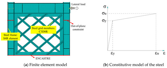 The finite element model of the SGSW is shown in Figure 11a. The dimension of each component in the model was taken according to the specimen in Section 4.2. The boundary steel frame was modeled using the S4R element, while the C3D8R element was used to simulate the embedded steel grid components and the fish plate. The mesh size of the boundary beam and column was 50 mm, and that of the steel grid components was 30 mm. The influence of welding residual stress was ignored, and all the components in the structure were connected by *Tie. The base of the SGSW was fully fixed to the ground, and the out-of-plane displacement was restricted. The material properties of steel were simulated by the elastoplastic model (Figure 11b), and the data in the constitutive model were obtained from the tensile test at room temperature.