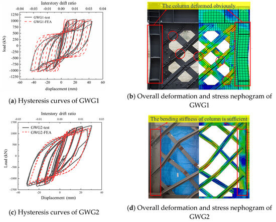 The comparison of the test and simulation results are illustrated in Figure 14 and Table 3. It could be found that the hysteresis curves obtained by the experiments and simulation agreed well, and the results of the finite element calculation could accurately reflect the whole and local deformation of both the structure and each component. And the error in the peak load was also minimal, indicating that the finite element model was able to accurately predict the lateral-resistant capacity of the SGSW. Overall, the finite element model demonstrated high accuracy in predicting the structural performance.