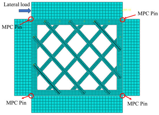 (2) The frame beam and column connections were ideal hinge joints, which only served as the edge members of the SGSWs. The formula derived in this paper essentially calculated the lateral-resistant capacity provided by the steel grid components when they all fully developed, without considering the contribution of the steel frame. Therefore, the beam–column joints were set as ideal hinges to eliminate the effect of the frame.
