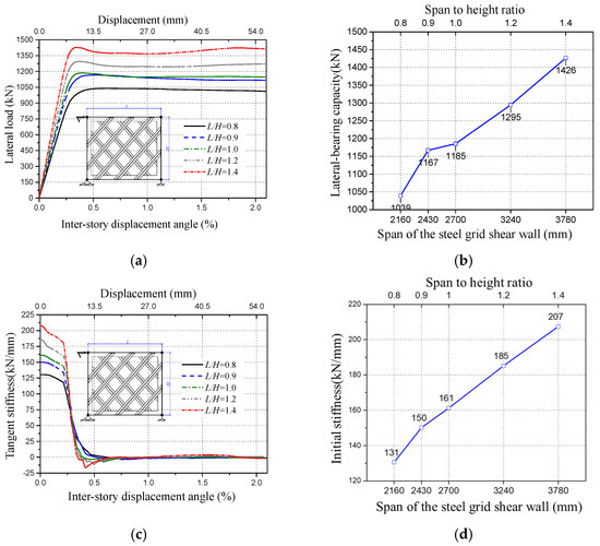 Pushover analysis results of grid-shaped steel shear wall with different span–height ratios: (a) Horizontal load–displacement curve; (b) Comparison of lateral load bearing capacity; (c) Tangent stiffness–displacement curve; (d) Comparison of initial stiffness.