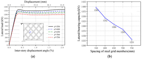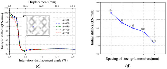 Figure 17a shows the load–displacement curves of the SGSWs with different spacing between the steel grid components, while Figure 17b shows the variation in the lateral-bearing capacities as the spacing increased. The tangent stiffness–displacement curves are shown in Figure 17c,d illustrates the evolution of initial lateral stiffness as the function of the spacing.