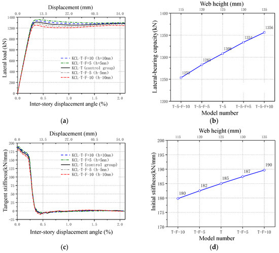 It can be found from Figure 18 that the tangential stiffness decreased sharply when the inter-layer displacement angle reached 0.3% but stabilized once the displacement angle reached 0.5%. The lateral-resistant capacity and initial stiffness demonstrated 8.22% and 5.56% enhancement, respectively, as the web height increased from 115 mm to 135 mm.