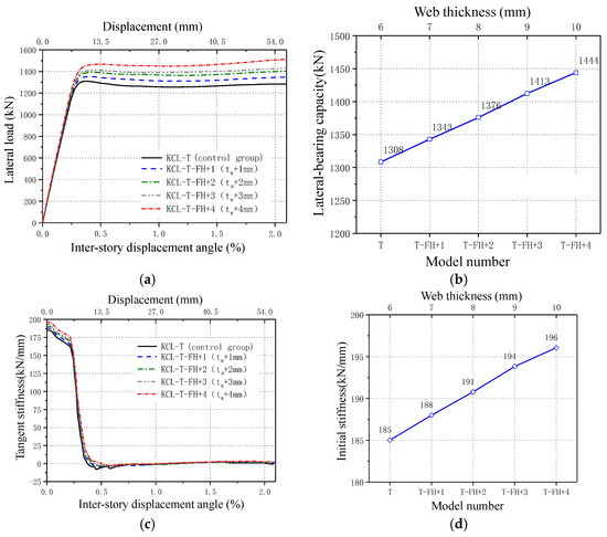 Pushover analysis results of the SGSW with different web thickness: (a) Horizontal load–displacement curve; (b) Comparison of lateral load bearing capacity; (c) Tangent stiffness–displacement curve; (d) Comparison of initial stiffness.