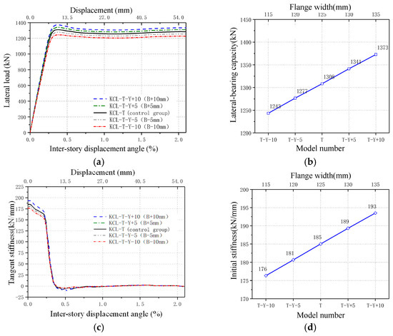 Pushover analysis results of the SGSW with different flange width: (a) Horizontal load–displacement curve; (b) Comparison of lateral load bearing capacity; (c) Tangent stiffness–displacement curve; (d) Comparison of initial stiffness.