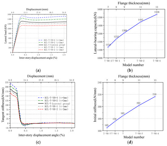 Pushover analysis results of the SGSW with different flange thickness: (a) Horizontal load–displacement curve; (b) Comparison of lateral load bearing capacity; (c) Tangent stiffness–displacement curve; (d) Comparison of initial stiffness.