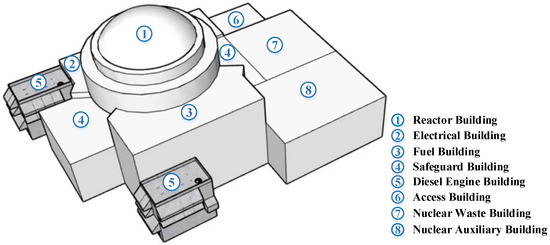 The emergency diesel generator set in the diesel engine building, as the emergency alternating current power supply in the nuclear power plant [29], is mainly used to ensure the safe shutdown of the reactor and prevent the damage of important equipment due to the loss of the normal external power supply system, which requires the diesel engine generator set to have good seismic performance and fast start-up capability. The diesel engine building is the last barrier when the nuclear power plant suffers a major accident. The schematic diagram illustrating the location of the diesel engine building within the nuclear island building is presented in Figure 1.