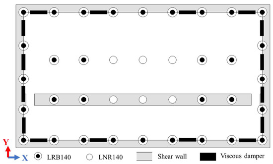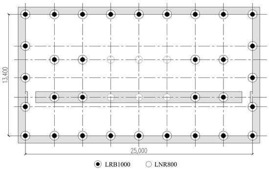 The seismic prototype of the test structure is the diesel engine building of a nuclear power plant, which is a reinforced concrete shear wall structure and adopts raft foundation. The total weight of the structure is about 14,246 t, the plane size of the structure is 26.60 m × 15.00 m, and the overall structure is divided into two parts above ground and below, with the highest five floors above ground 24.30 m. The bottom surface elevation of the bottom plate of the underground two layers is −12.60 m, and the total height is 36.9 m. The isolation layer is added on the basis of the seismic structure. The design isolation layer is composed of 6 natural rubber bearings (LNR800) in the middle and 32 lead rubber bearings (LRB1000) in the periphery. The layout diagram of the isolation bearings is shown in Figure 2.