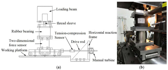 There are some differences between the mechanical properties of the scaled model bearing and the conventional bearing, so the compression–shear test device designed by ourselves is used to carry out the vertical compression test and compression–shear test on the same batch of isolation bearings used in the shaking table test, as shown in Figure 4. The compressive stress of the vertical compression test is 2 MPa, 4 MPa, and 6 MPa. The vertical stiffness of the LRB and LNR measured is shown in Table 3.