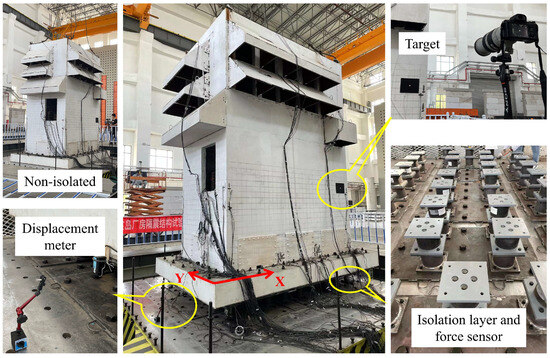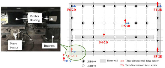 The axial force and horizontal force of the isolation layer of the test model are collected by multi-dimensional force sensors, LRB at the corner points, and LRN in the middlesare respectively selected for measurement. The three-dimensional force sensor can measure the three-directional force of the bearings, and the two-dimensional force sensor can measure the axial force and a unidirectional horizontal force. The layout of the isolation bearings in the experimental model, as well as the arrangement and collection direction of the multi-dimensional force sensors, are shown in Figure 5.