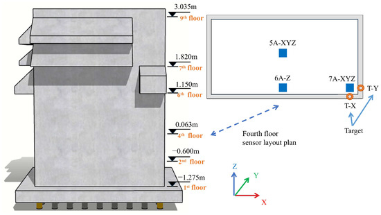 The test model of the isolation structure removes the bottom isolation layer, and the superstructure is the seismic test structure model. Therefore, the sensor arrangement of the superstructure of the isolation test model and the seismic test structure is the same. In addition to the three-dimensional accelerometer arranged on the shaking table, the acceleration measurement is also carried out on six floors of the superstructure; each floor is arranged with seven accelerometers, and three accelerometers are located at the floor’s corner No. 7 position to measure the three directions. Another is located at the middle edge of the floor No. 6 position to measure the Z-direction acceleration, and the remaining three accelerometers are located at the middle of the floor No. 5 position to measure the three directions of acceleration. The position of the accelerometers on each floor is the same, but it is slightly changed due to the placement of the counterweight, as shown in the position of the blue square in Figure 7.