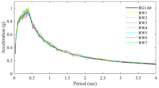 Seven groups of three-dimensional artificial waves (RW1~RW7) [33] were selected for the test. Each group of waves was fitted according to the RG1.60 standard spectrum [34] with a damping ratio of 5% and a PGA of 0.3 g. Different components were used in the three directions, and the peak acceleration ratio was 1:1:1. The response spectrum curve of the artificial wave is shown in Figure 8, which can be well fitted with the RG1.60 response spectrum.