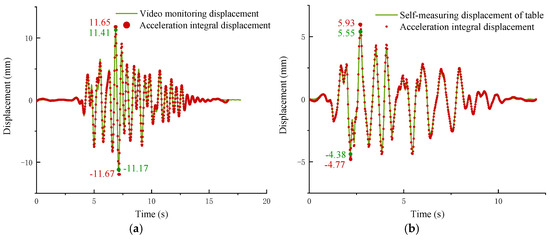 Comparison of displacement calibration results: (a) accelerometer integration and video monitoring; (b) accelerometer integration and shaking table self-measurement.