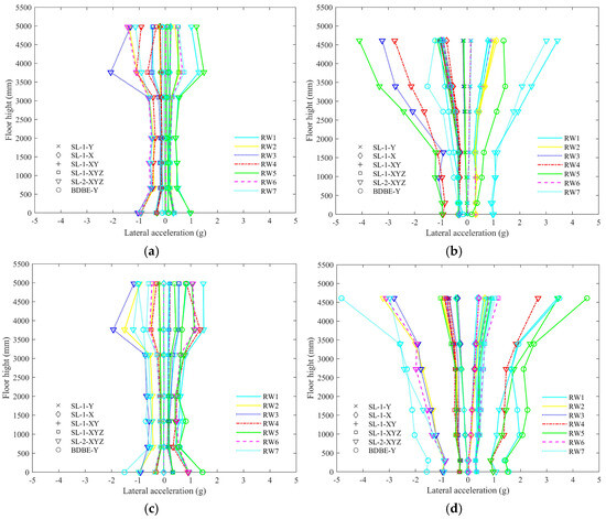 Acceleration envelope of isolated and non-isolated test models: (a) X-direction acceleration envelope diagram of isolation model; (b) X-direction acceleration envelope diagram of a non-isolated model; (c) Y-direction acceleration envelope diagram of isolation model (d) Y-direction acceleration envelope diagram of a non-isolated model.