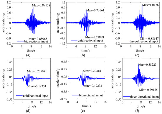 Comparison of the top Y-direction acceleration time–history curve under unidirectional, bidirectional, and three-directional ground motion input of the test model: (a) non-isolation condition 6; (b) non-isolation condition 20; (c) non-isolation condition 27; (d) isolation condition 6; (e) isolation condition 20; (f) isolation condition 27.