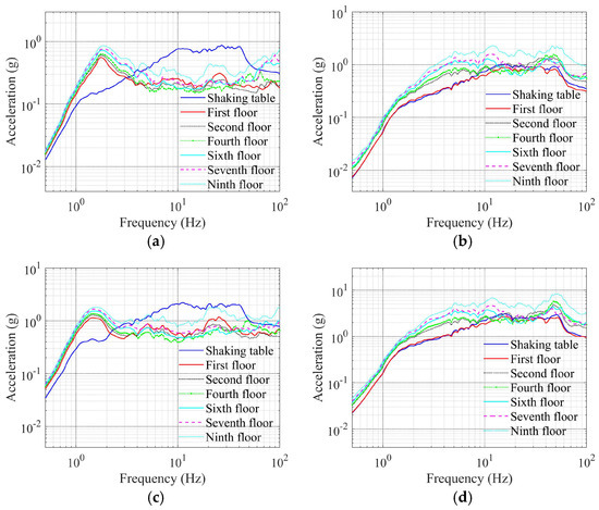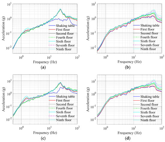 Y-direction acceleration response spectra of different horizontal floors of isolated and non-isolated models: (a) SL-1 isolation (working condition 29); (b) SL-1 non-isolated (working condition 29); (c) SL-2 isolation (working condition 37); (d) SL-2 non-isolated (working condition 37).