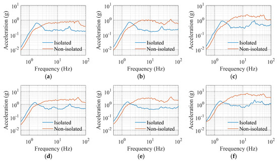Comparison of X-direction acceleration response spectra of the same floor in isolated and non-isolated models: (a) SL-1 2nd floor (working condition 27); (b) SL-1 6th floor (working condition 27); (c) SL-1 9th floor (working condition 27); (d) SL-2 2nd floor (working condition 35); (e) SL-2 6th floor (working condition 35); (f) SL-2 9th floor (working condition 35).
