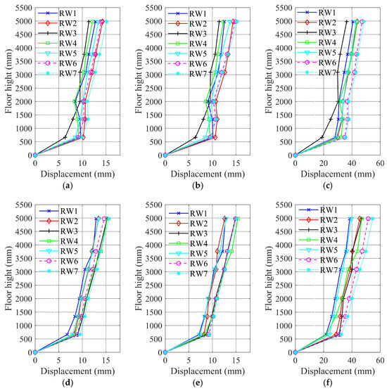 As shown in the figure, the acceleration in the X and Y-directions of the non-isolated model shows a significant increasing trend with the increase in floor height, demonstrating the characteristic of dynamic amplification of non-isolated structures, and the increase in earthquake level makes this trend greater. The acceleration envelope diagram of the isolation model shows that the acceleration envelope below an elevation of 3 m (6 floors) is relatively evenly distributed along the height, reflecting the characteristics of the isolated rigid structure. But there is an increase in the acceleration envelope at an elevation of 3–3.5 m. After observation and analysis, it is believed that this area is located in the assembly layer, and there are some shrinkage cracks on the surface of the post-poured concrete and changes in the connection stiffness. The protruding window on the upper wall also causes an increase in the moving mass and moment of inertia, resulting in a change in the regularity of the dynamic response of this layer. The reason why this phenomenon did not occur in non-isolated structures is that, in order to ensure the consistency of the total mass of the two models, after removing the isolation layer of the isolated model, weights were added, and some weights were placed on the top of the structure.