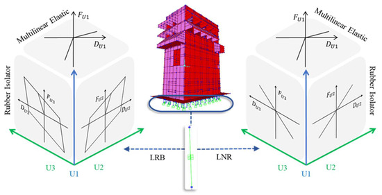 In order to compare with the data obtained from the seismic isolation model test, a finite element model consistent with the conditions of the shaking table test model was established using SAP2000 for nonlinear time–history analysis. The parameters of the structural calculation model, especially the technical parameters of the isolation bearings, were identified to ensure the accuracy of the model calculation results. The SAP2000 finite element model used shell elements and beam elements to establish the main structure model, as shown in Figure 17. The horizontal behavior of the isolation bearings was simulated using the Rubber Isolator element, while the vertical behavior was simulated using the Multilinear Elastic element. Considering the difference in stiffness of the actual isolation bearings under tension and compression, the tensile stiffness of the bearings in the finite element model was set to 1/10 of the compressive stiffness.