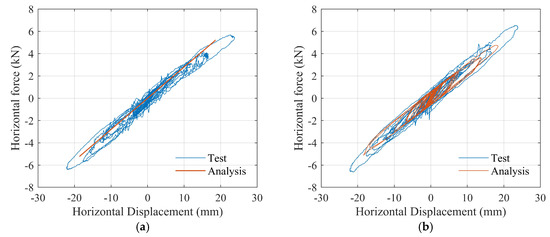 Comparison of hysteresis curves between finite element analysis results and test results of isolation model: (a) F2-3D(LNR) bearing in X-direction; (b) F6-2D(LRB) bearing in X-direction.