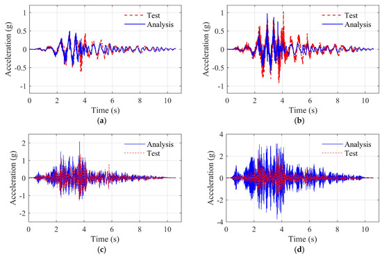 Comparison of the absolute acceleration between the finite element analysis results of the isolation model and the test results: (a) Level 1 X-direction; (b) Level 9 X-direction; (c) Level 1 Z-direction; (d) Level 9 Z-direction.