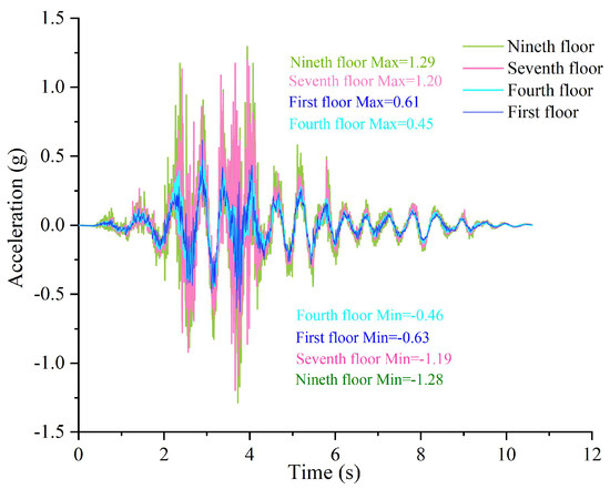Acceleration time–history curves of the floors for working condition 31 of the seismic isolation test.