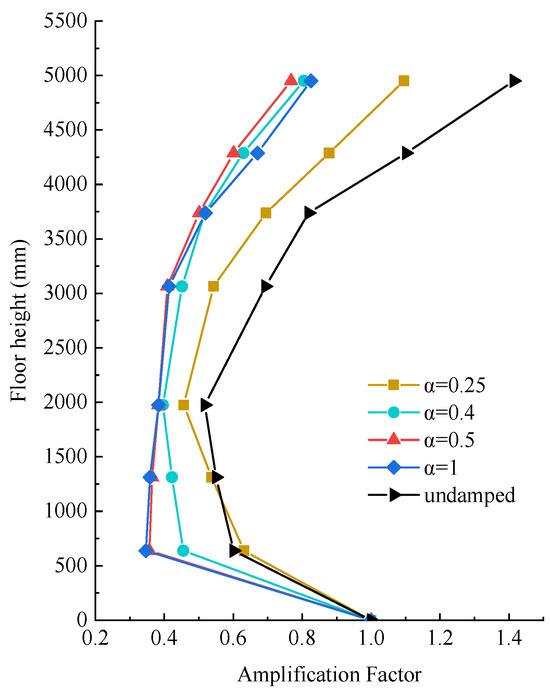 The acceleration amplification factor diagrams for the models are shown in Figure 23. For Scheme 1, the peak floor accelerations initially decreased and then increased with floor height, indicating an overturning effect. This phenomenon was somewhat mitigated in Schemes 2 and 3, but a slight overturning effect still persisted. In Schemes 4 and 5, the peak floor accelerations increased with floor height, demonstrating an improvement in the overturning effect. Therefore, it is recommended to use viscous dampers with a damping coefficient of 19 kN∙s/m and damping exponents of 0.5 or 1.