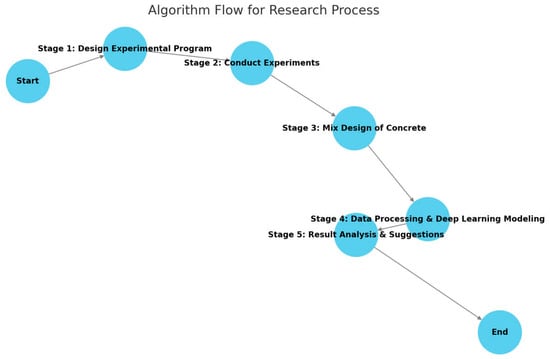 The purpose of this part is to outline the research methodology and study approach. This section explains the principles of the laboratory program, the materials used, and the method of deep learning modeling. In addition, preliminary information about the research is provided, and the analysis of the results is discussed in the following section. The research methodology algorithm is briefly summarized in Figure 1 without a breakdown structure. Each phase of this flowchart has several subphases, which are described in detail in the next section. The laboratory program in this study is based on ABA and ACI standards, and all material and concrete tests were conducted according to ASTM standards. Material tests such as aggregate gradation, water consumption, and cement also followed ASTM standards and guidelines.
